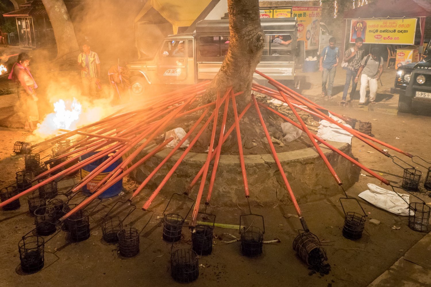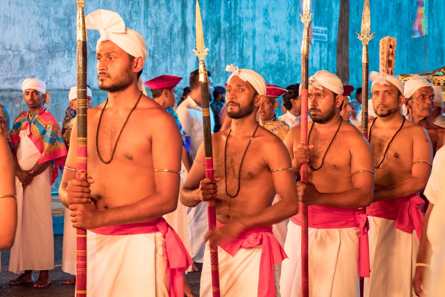 For the next four evenings after Kapsituweema, each devale have a small perahera around the place where the jack-fruit piece was planted. The ceremonies are made of musicians (especially drummers), flags bearers, spear-men and holders of “Ranayudha” – the sacred insignia of the god.